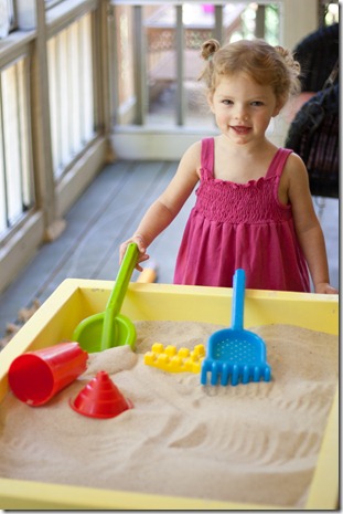 Addie was the lucky raffle winner of a Sandbox at the One Small Step Walk we went to on Saturday. But not just any boring sandbox. This one has wheels so we can move it around wherever we want (it’s out on the screened in porch for now), and the lid for it is actually a chalkboard. Addie L.O.V.E.S. it. She insisted on getting new shovels for her sandbox at Target, and has been in heaven playing in it. Who knew it would be so entertaining. And the bonus is, she is perfectly content to play in it all be herself. So I can sit on the porch swing with my laptop while she plays her sandy little heart out.